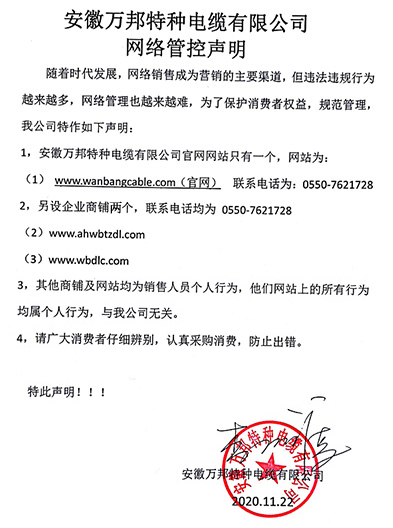 鄭重聲明:安徽萬邦特種電纜有限公司官方網站為:www_wanbangcable_com.dy220.com,除此之外無任何子網站或合作網站,其余均為假冒偽劣。電話:0550-7621728 13485756353 地 址:安徽省天長市滁州高新技術產業開發區經四路29號
